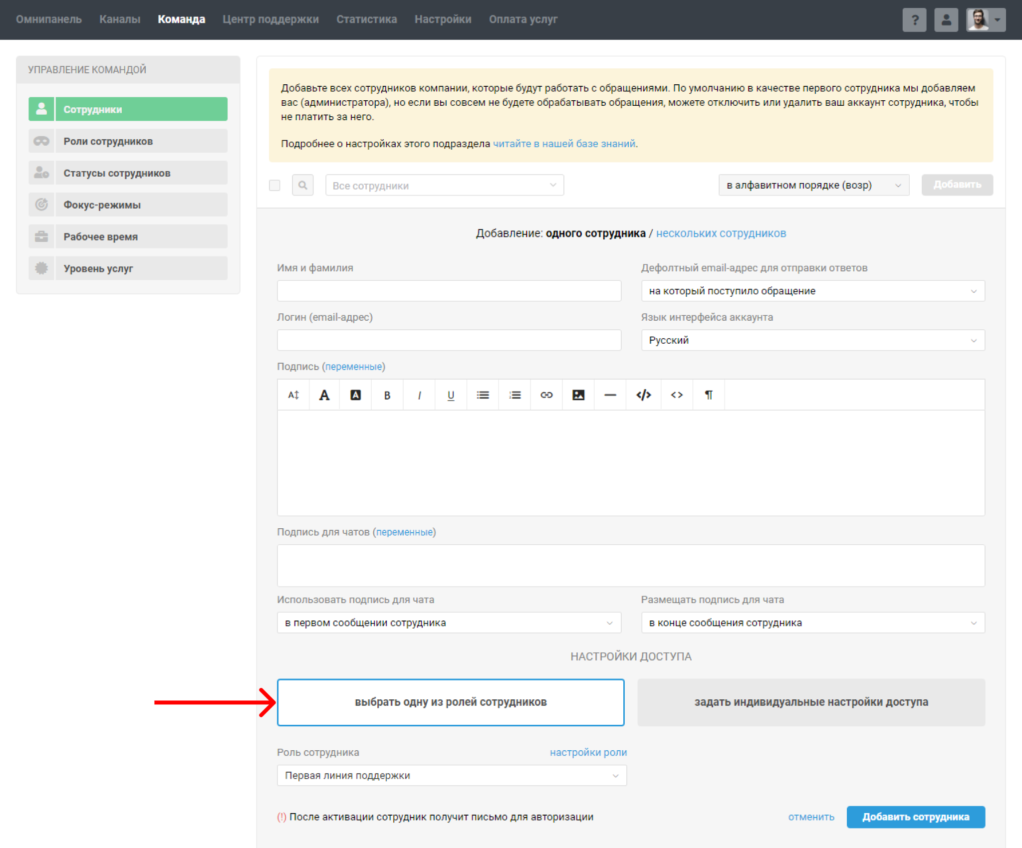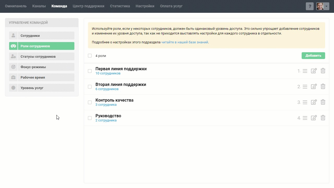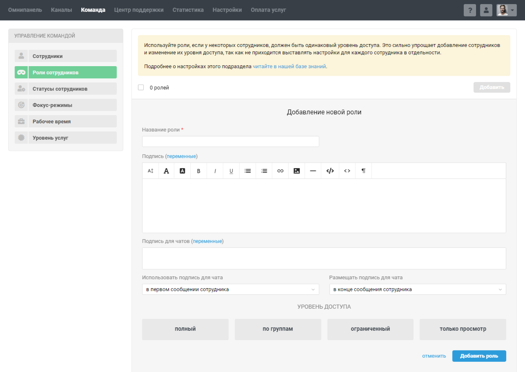 Роли — заранее определенные наборы настроек подписи, доступа и дополнительных прав. Можете один раз задать нужные настройки, например, для разных отделов компании или линий поддержки, и затем просто указывать подходящую роль при изменениях внутри команды или при добавлении новичка.