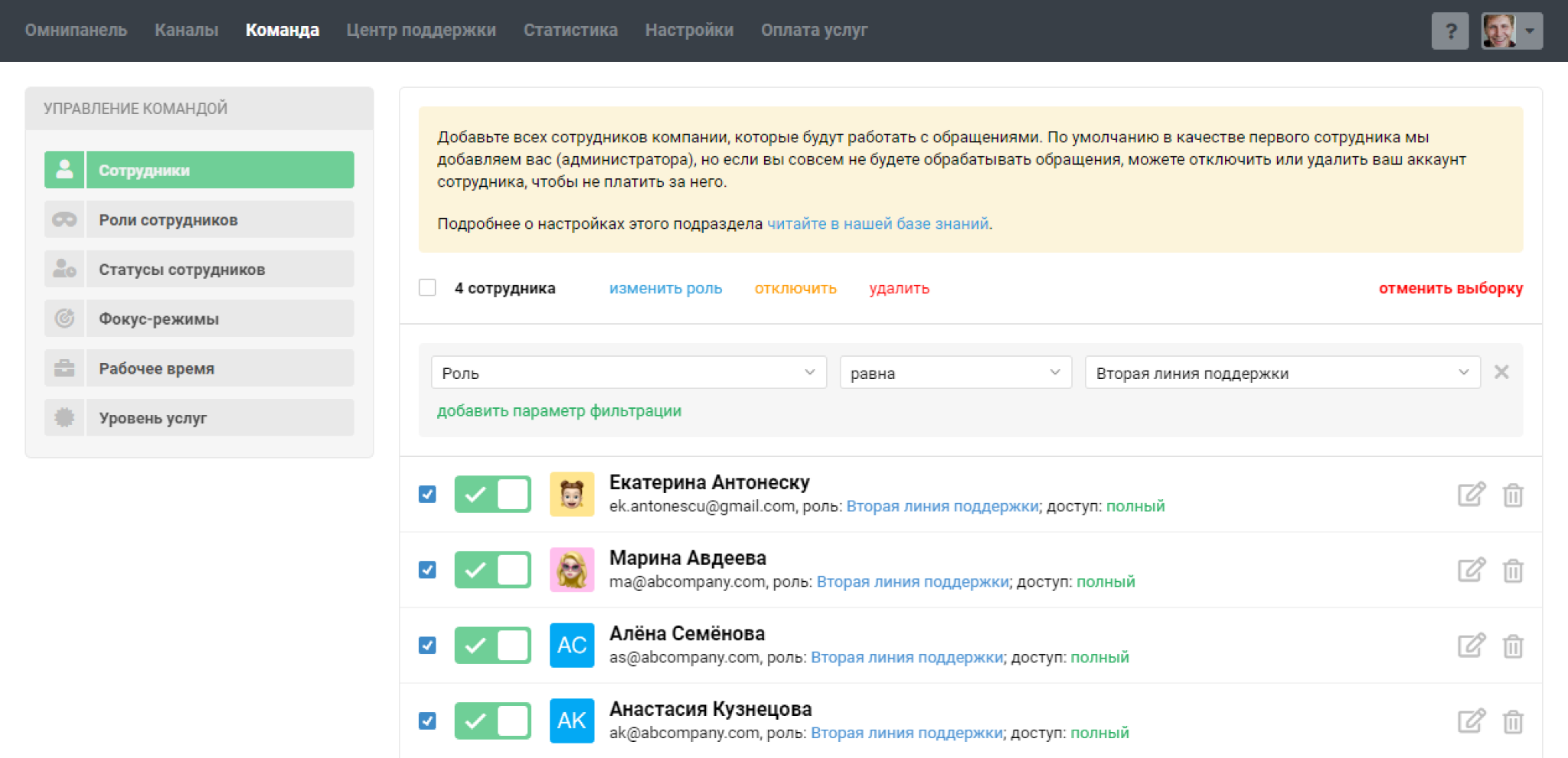 2. Через фильтр в списке сотрудников. При работе с фильтром доступны массовые действия: можно отключить или удалить сотрудников или изменить их роль на другую.