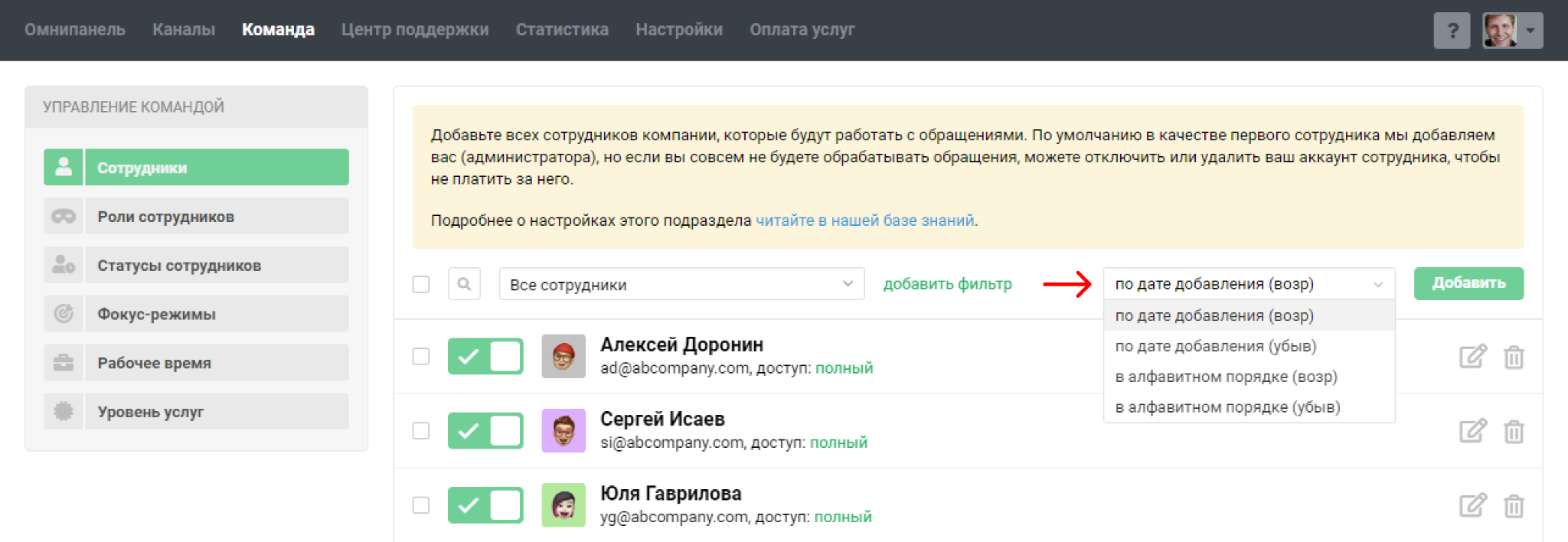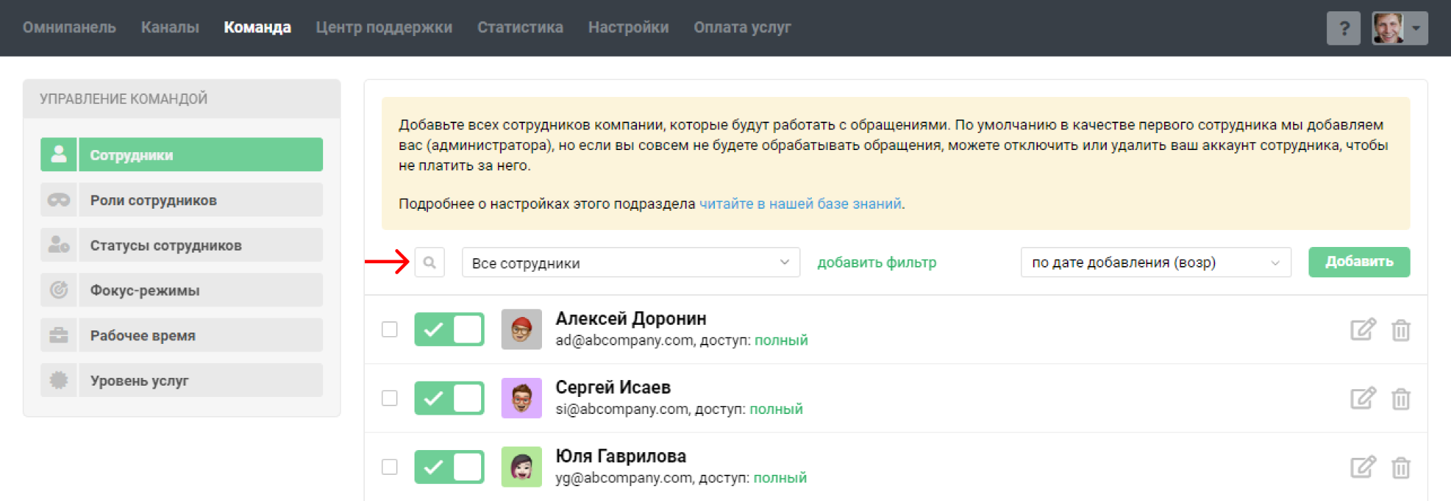 Подраздел «Сотрудники» в разделе «Команда» позволяет добавлять сотрудников и гибко настраивать их права доступа. Рассмотрим основные возможности: