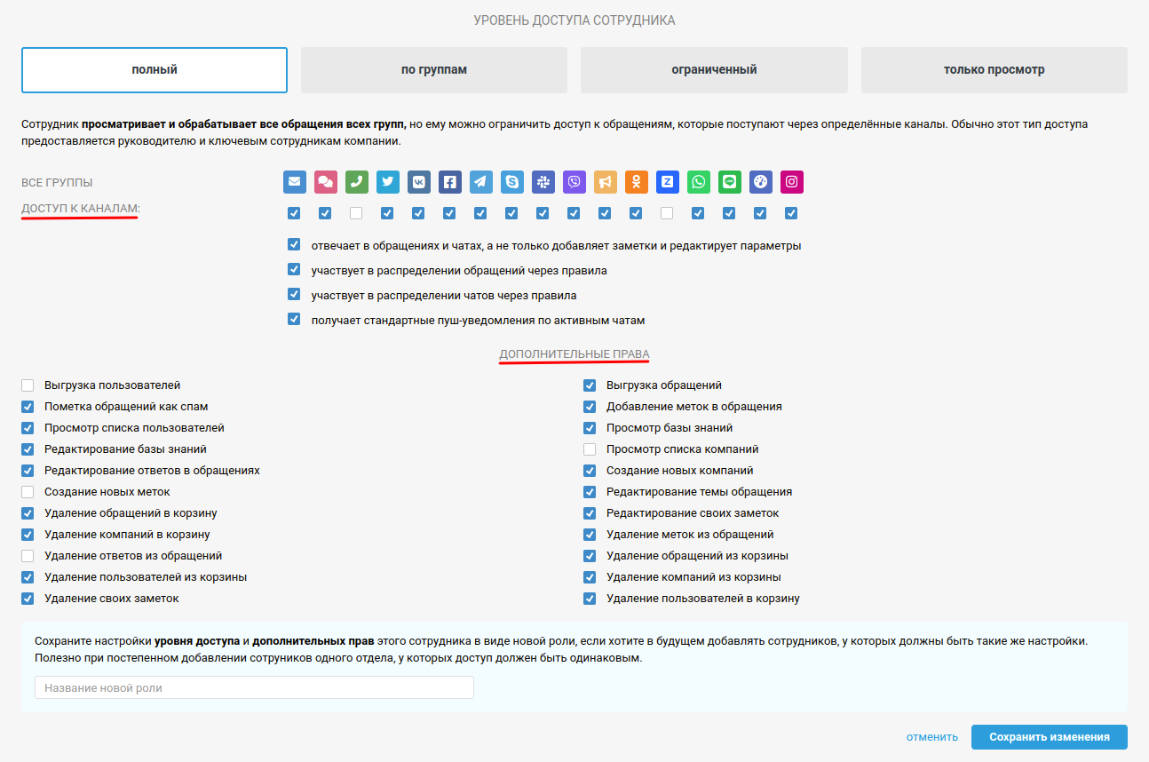 Полный доступ позволяет сотруднику видеть все обращения во всех группах. Этот уровень доступа следует назначать руководителям, менеджерам высшего звена или старшим саппортерам.