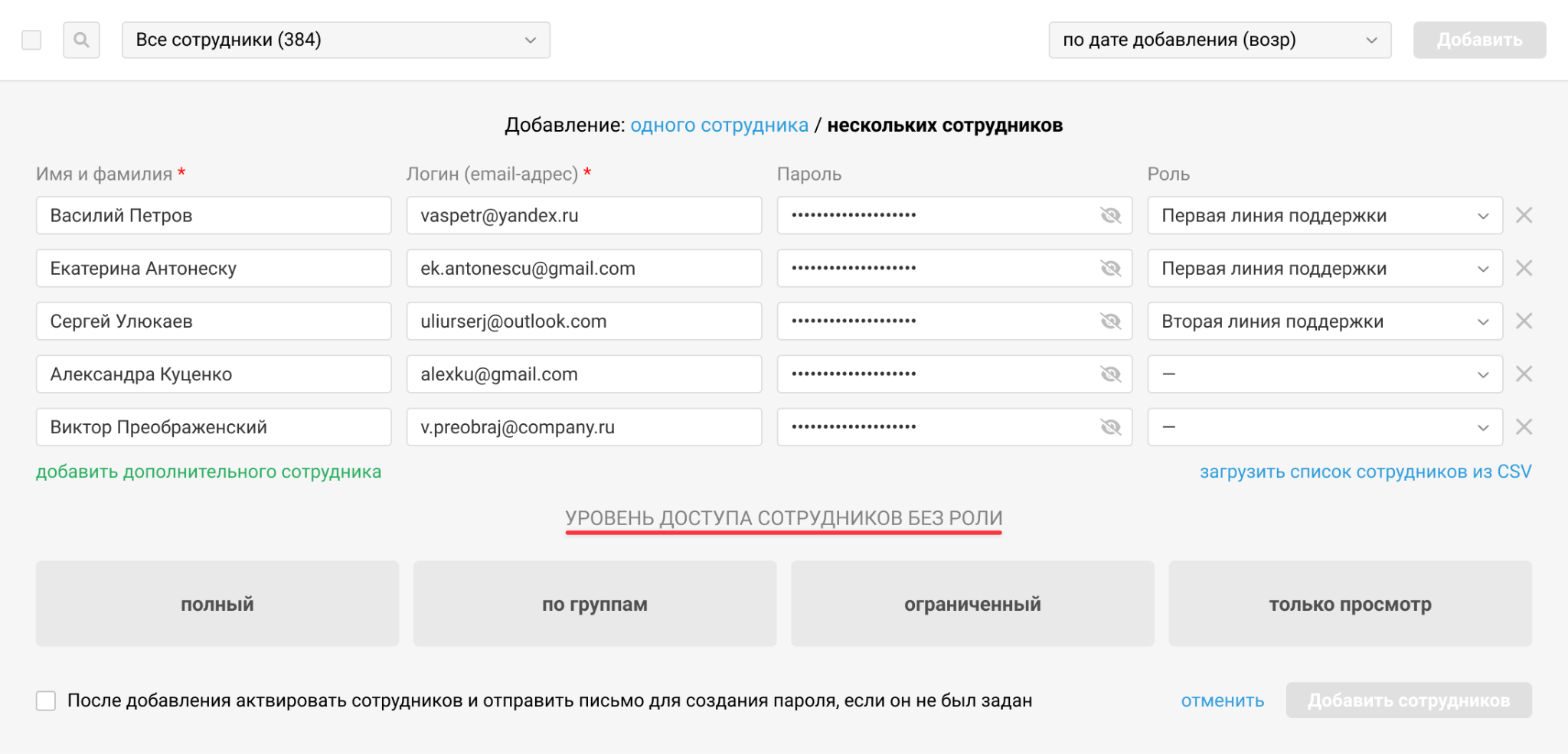 Создавать новых сотрудников можно не только вручную, но и импортом данных из файла формата CSV, в котором можно указать имя, email-адрес, пароль и роль.