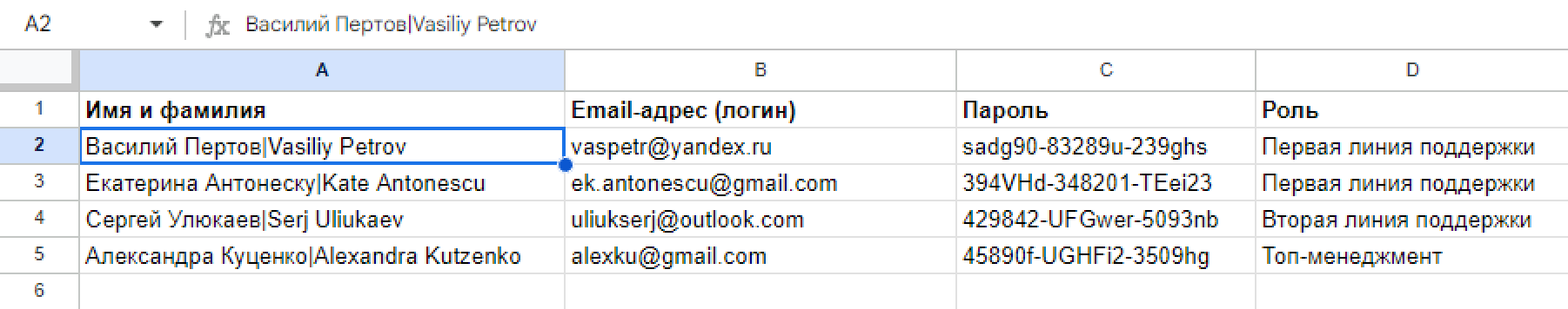 PRO подсказка: Если у вас добавлено несколько языков для оказания поддержки, в ячейке с именем сотрудника можете передавать варианты имени сотрудника сразу на всех языках. Для этого нужно использовать вертикальную черту в качестве разделителя «|» и указать имена на разных языках в том же порядке, в котором они добавлены в настройках (аккаунт администратора → раздел «Настройки» → подраздел «Локализация»).