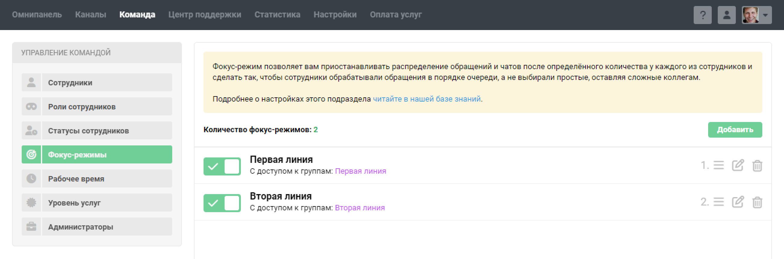 Теперь рассмотрим подробнее доступные настройки в фокус-режимах, а также примеры правил для распределения и перераспределения обращений.