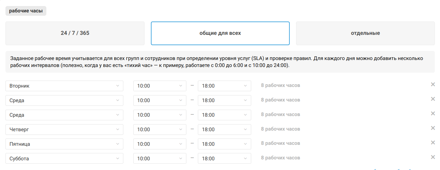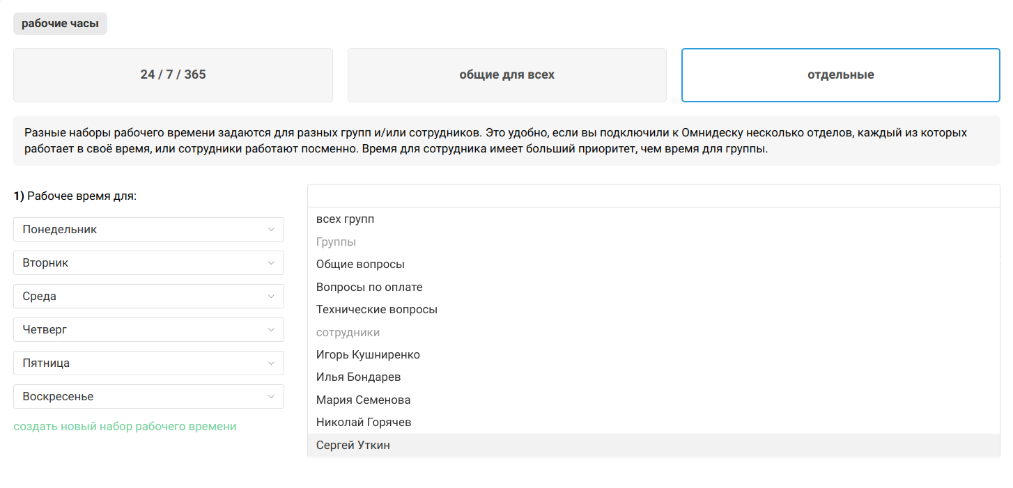 Если же поддержка клиентов осуществляется не круглосуточно, вам следует указать дни недели и часы, когда сотрудники работают. Для этого есть два варианта: «Общие для всех» и «Отдельные».