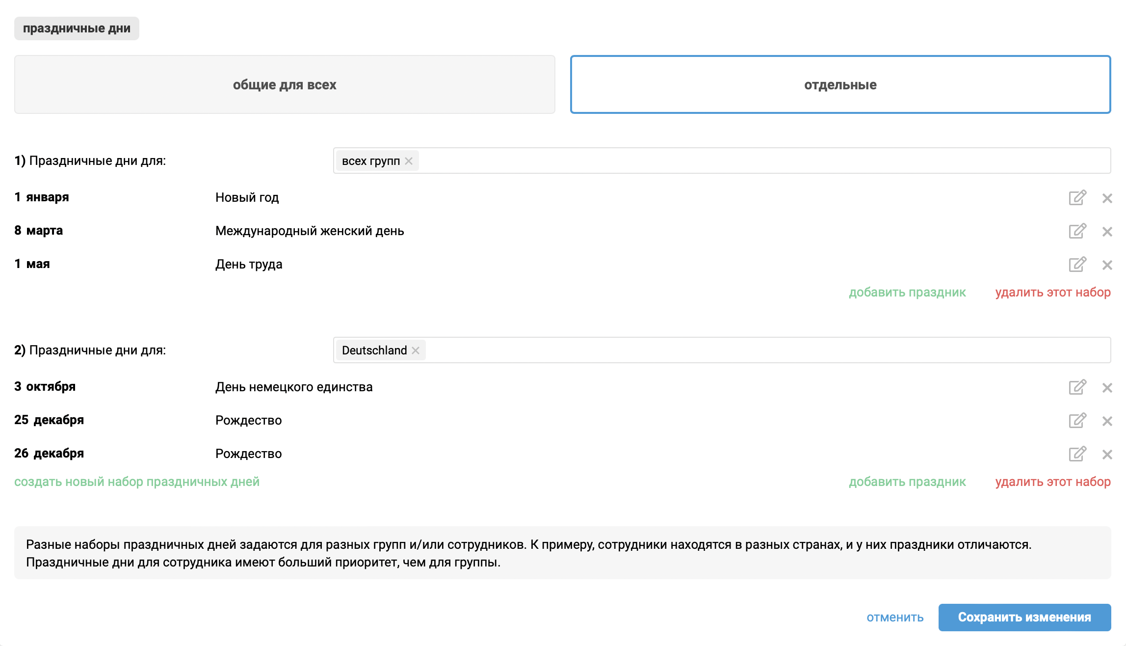 В каждый новый аккаунт добавлены 5 праздничных дней (наиболее распространенные), но при желании вы можете их отредактировать, удалить или добавить новые. Для праздников, по аналогии с рабочими часами, можно создавать отдельные наборы — для каждого сотрудника или группы.