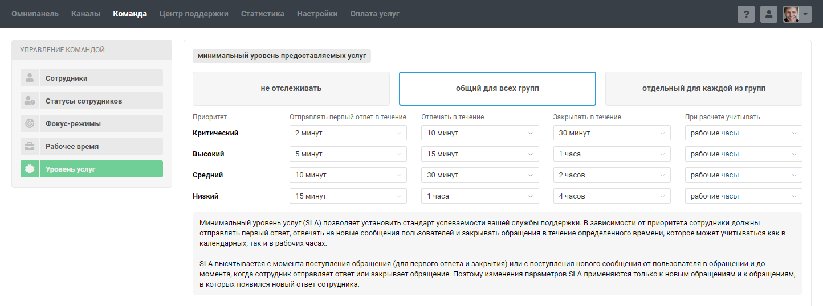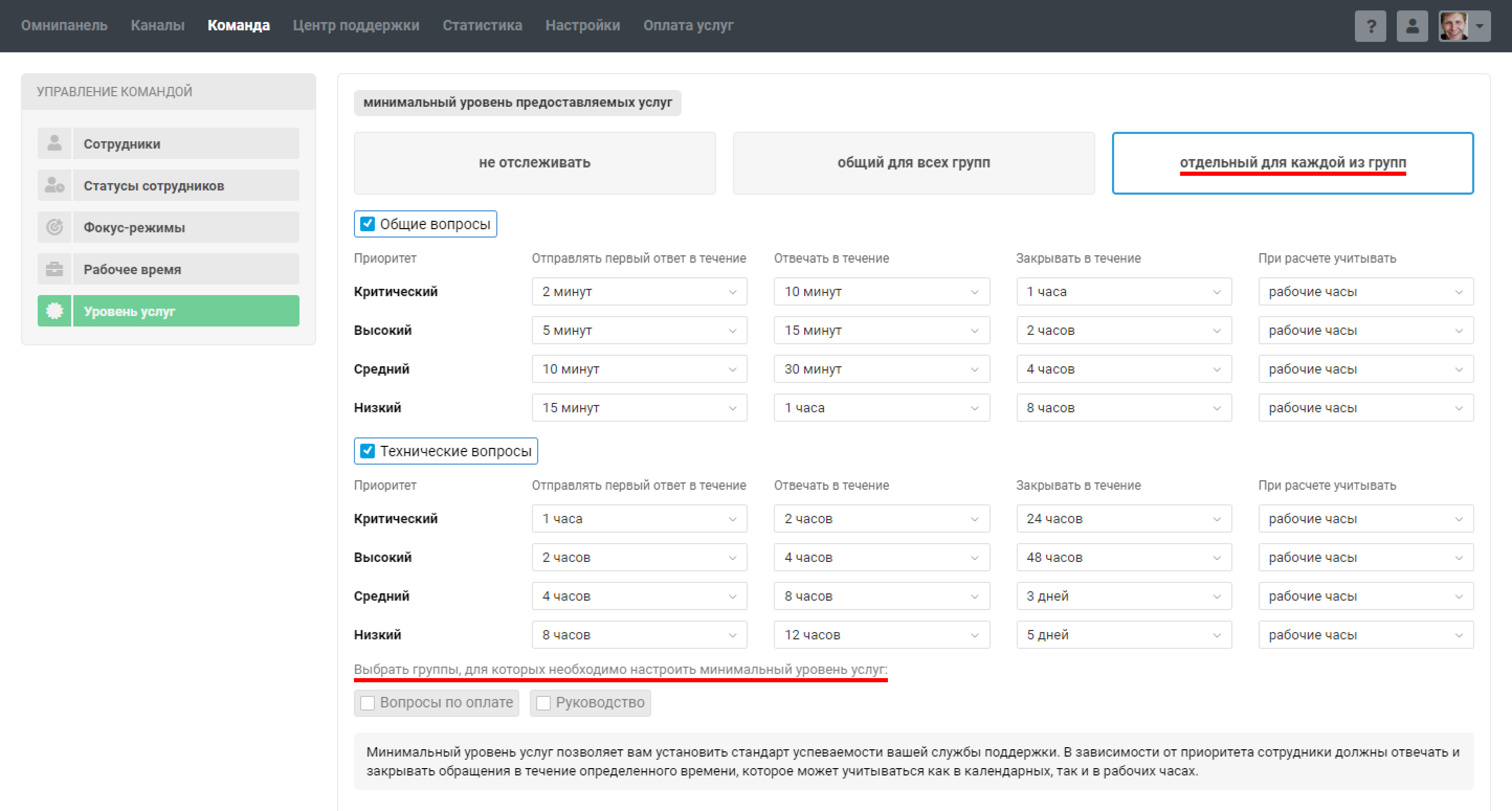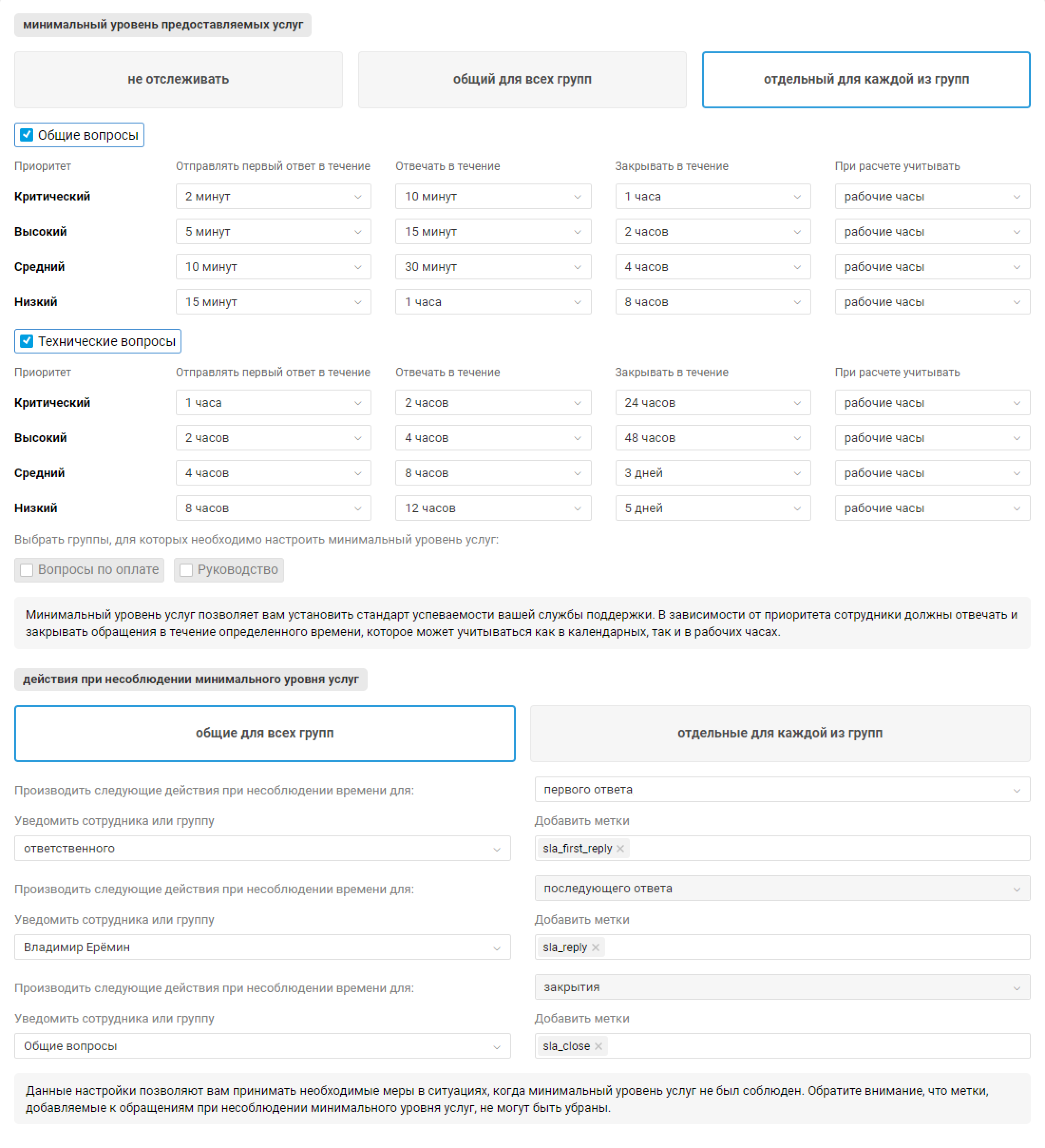 В первом блоке вы можете выбрать вариант «не отслеживать» или же задать стандарт успеваемости вашей службы поддержки. В зависимости от приоритета сотрудники должны отправлять первый ответ, отвечать на каждое последующее сообщение пользователя и закрывать обращения в течение указанного времени, которое может учитываться как в календарных, так и в рабочих часах.