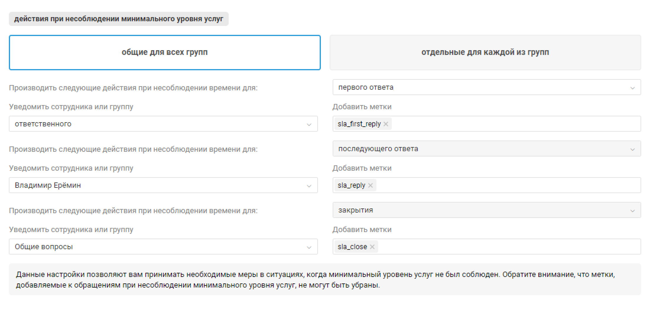 Во втором блоке вы задаёте действия, которые должны выполняться при несоблюдении минимального уровня услуг. Можно настроить отдельные действия при несоблюдении SLA для: