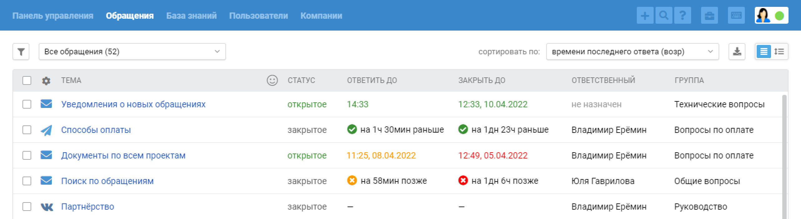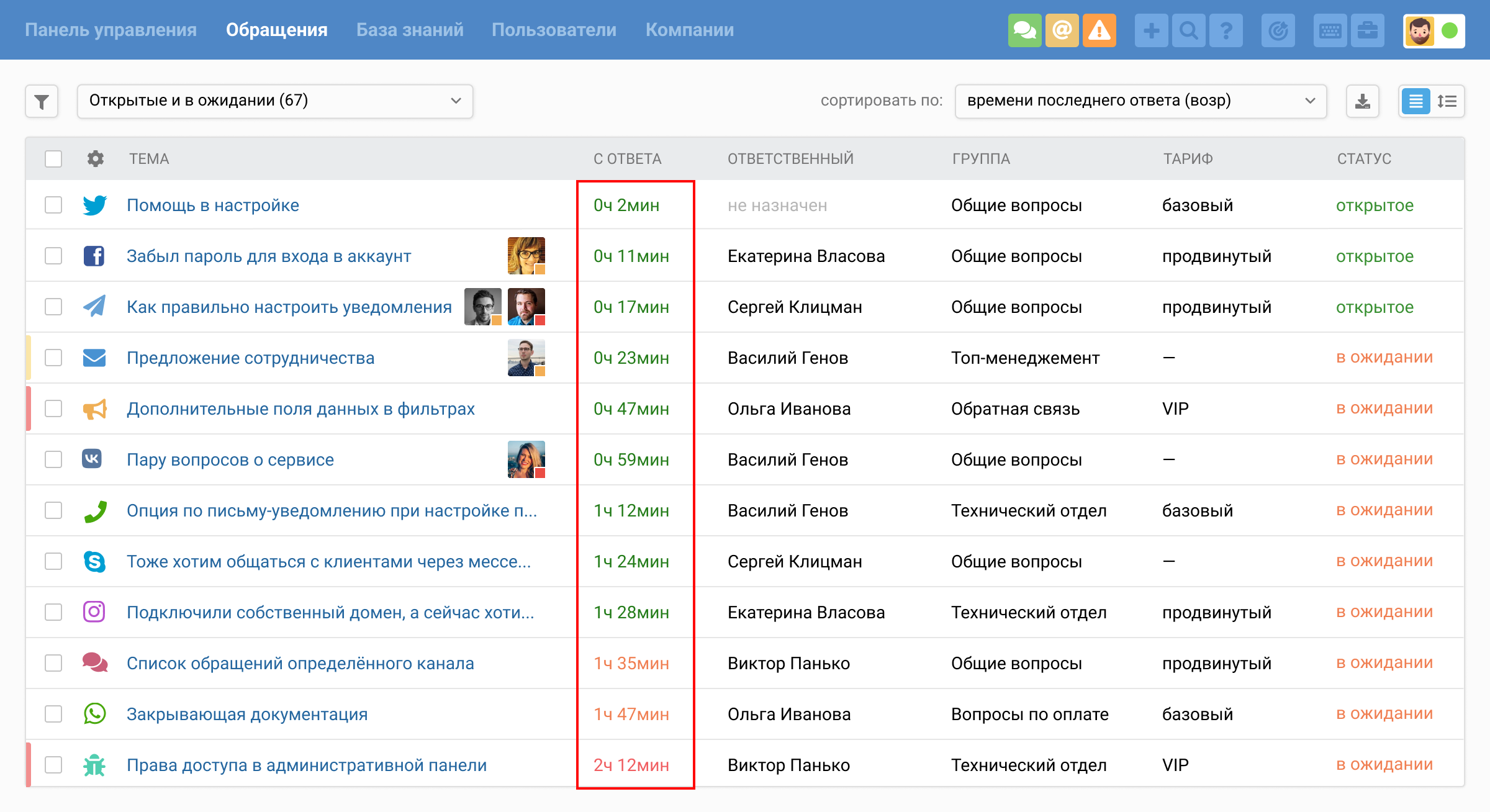 В списке обращений сотрудники могут визуально отличить обращения, по которым не соблюдается минимальный уровень услуг. Для этого достаточно посмотреть на цвет времени в столбце «С ответа» (сколько времени прошло с последнего ответа):